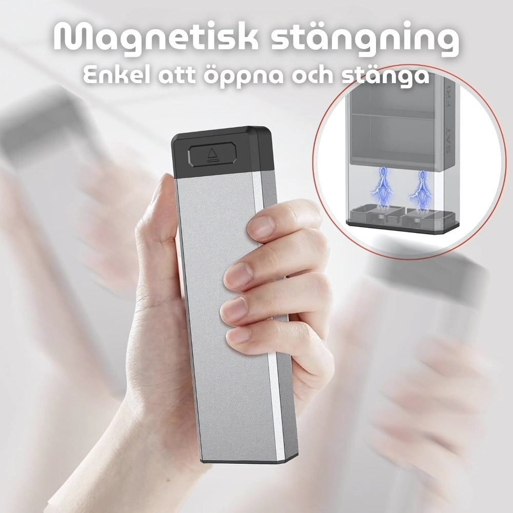 Säker förvaring: Den starka magnetiska stängningen gör att tabletterna är säkert förvarade under hela resan.